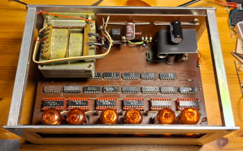 Es handelt sich um eine komplett in TTL Technik aufgebaute Uhr aus den frühen 70er Jahren.