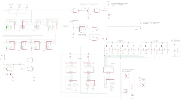 Die Technik der Uhr besteht aus einer Vielzahl von TTL Logikbausteinen.