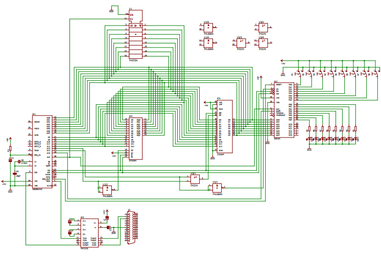 Dazu noch zwei TTL Bausteine als Adressdecoder, ein RS232 Pegelwandler und ein Latch zur Trennung des kombinierten Adress- und Datenbus des 8085A.