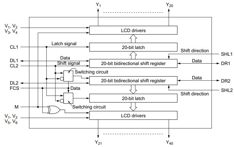 Der HD44100 enthält im Wesentlichen zwei 20 Bit Schieberegister.