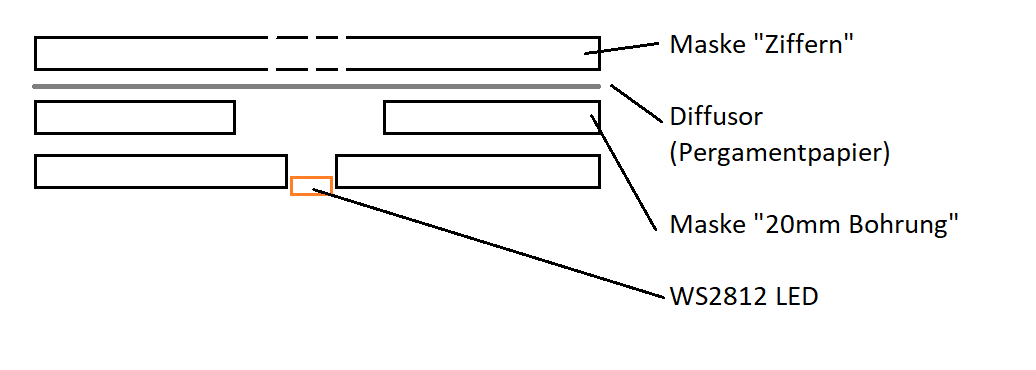 Die RGB / Neopixel LEDs sind einzelne Abschnitte eines RGB Streifens, die mit Heißkleber hinter die letzte Sperrholzplatte geklebt wurden.