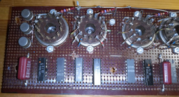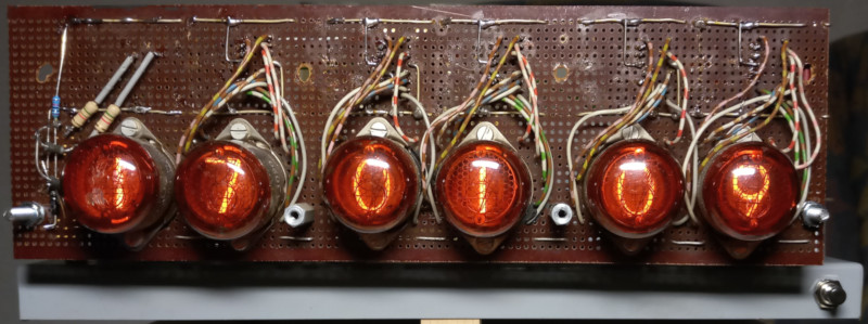Die ZM1020 Nixies sind zusammen mit diversen TTL ICs ebenfalls auf einer Lochrasterplatine montiert.