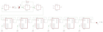 Dessen Frequenz wird mit sechs 7490 die als 10:1 Teiler geschaltet sind auf 1 Hertz heruntergeteilt.