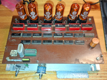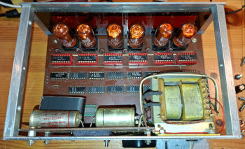 Die 74141 Nixie Treiber und der 74L00 für den Quarzoszillator sind gesockelt, alle anderen ICs sind direkt eingelötet.