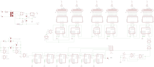 Der Sekundentakt wird von 7490 und 7492 Zählern gezählt und über 74141 1 aus 10 Decodern zur Anzeige gebracht.
