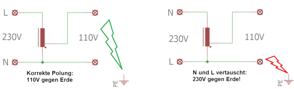 Das bedeutet, dass wenn der Euro Stecker "falsch" herum eingesteckt ist, an dem 110V Gerät immer noch 230V gegen Erde anliegen!