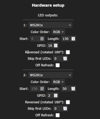 => Angeblich kann die WLED Software bei akzeptabler Refreshrate 1000 LEDs je Kanal ansteuern.