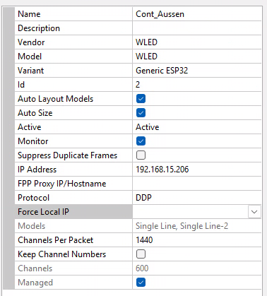 Zum Abschluss nur noch ein Screenshot, wie der ESP32 WLED Controller in xLights eingebunden wird:
