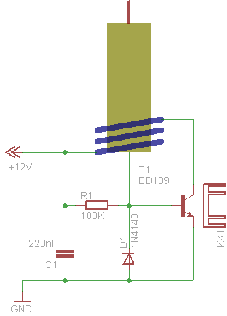 Der Kondensator C1 schließt die Versorgungsspannung hochfrequenzmäßig kurz, anderenfalls würde das Anschlusskabel der Stromversorgung in die Primärspule integriert werden.