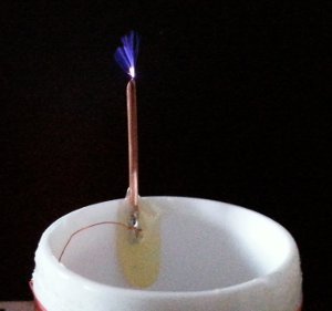 Bei sorgfältiger Abstimmung treten bei 12V Betriebsspannung sogar kleine Koronaentladungen (Streamer) aus der Spitze aus!