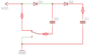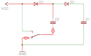 | Der Schalter verbindet den negativen Pol von C2 mit Masse, der Kondensator wird auf den Wert der Versorgungsspannung VCC geladen. | Der Schalter legt den negativen Pol von C2 an VCC. Jetzt wird die in C2 gespeicherte Ladung zu VCC aufaddiert und in C1 gespeichert. |