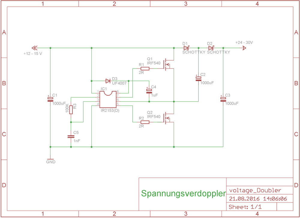 Leider eignet sich diese Schaltung nicht, um 6V Bordnetze auf 12V zu wandeln, da der IR2153 erst ab 10V arbeitet (Schutz der Mosfets vor Unterspannung).